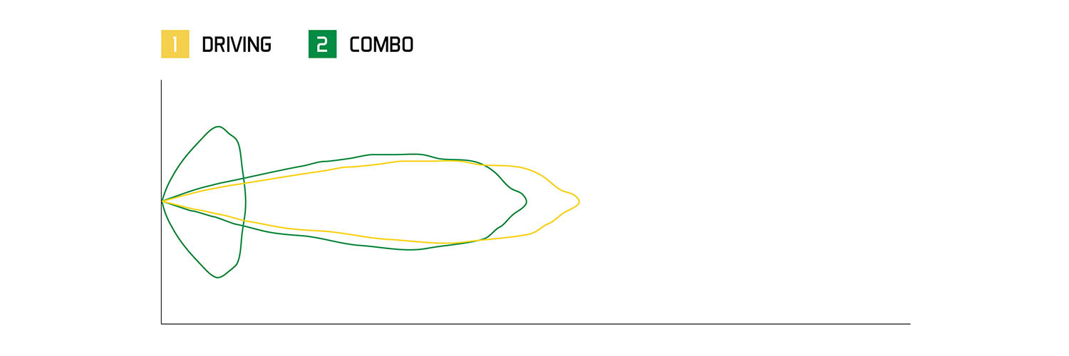 - Driving Beam: Projects a 20°x8° rectangular pattern that throws light far downrange for high-speed visibility.